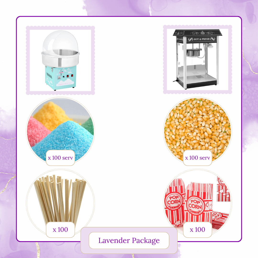 If you are planning a bigger size party, the Lavender Package is what you need. It includes the machine and supplies for 100 guests.