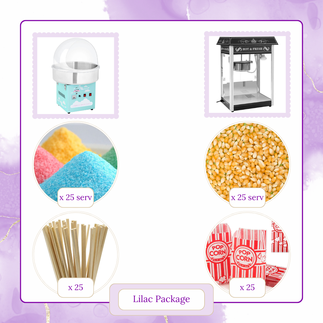 The Lilac Package is our most cost effective one, most suitable for kids’ parties or smaller gatherings. It includes the machine and supplies for 25 guests.